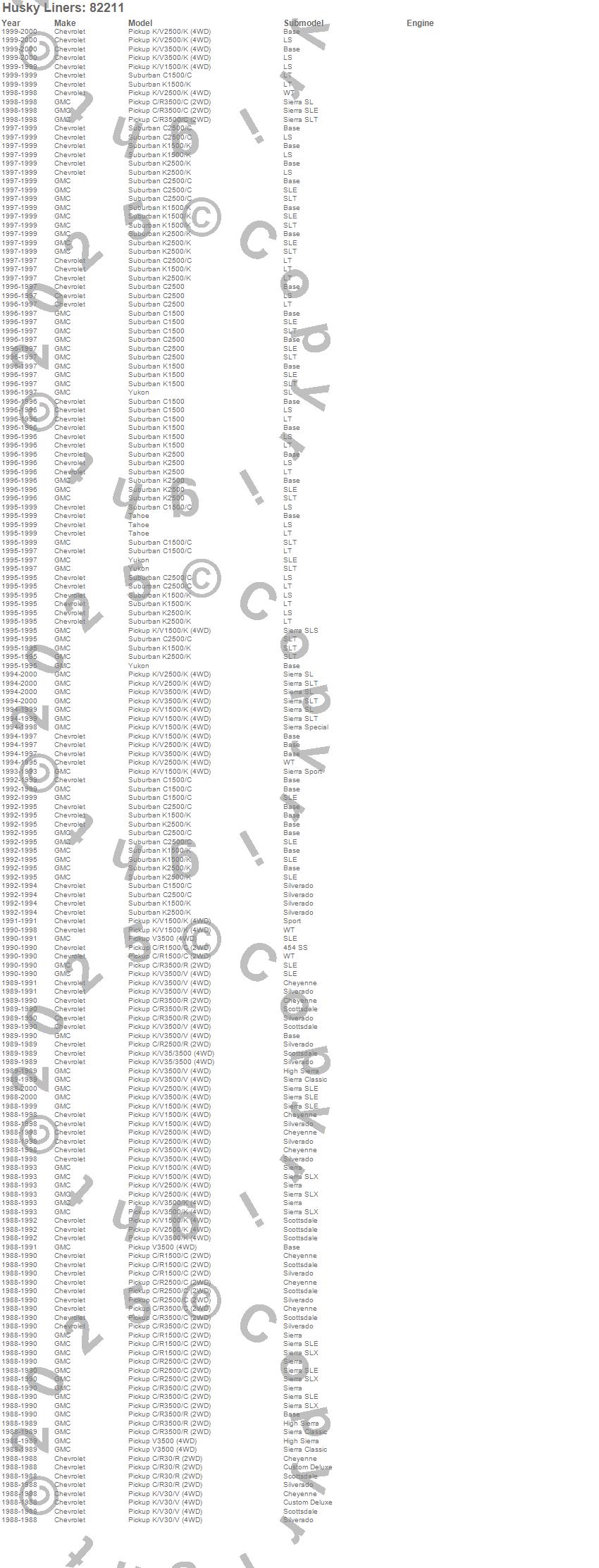 Below is an abbreviated list of applications for the Classic Style Floor Liner Center Hump.C1500 Pickup, C1500 Suburban, C2500 Pickup, C2500 Suburban, C3500 Pickup, K1500, K1500 Pickup, K1500 Suburban, K2500 Pickup, K2500 Suburban, K3500 Pickup, R2500 Pickup, R30 Pickup, R3500 Pickup, Tahoe, V30 Pickup, V3500 Pickup, Yukon, Chevrolet, GMC