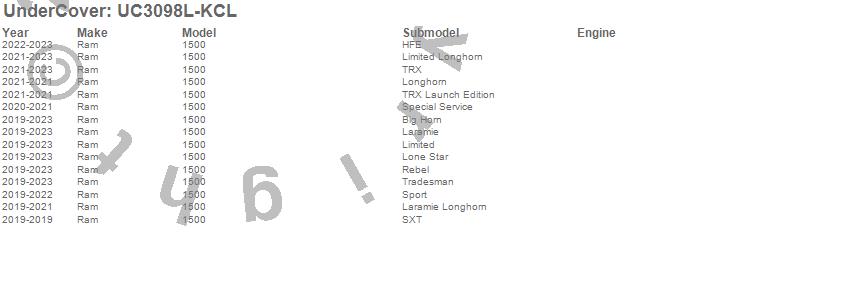 Brand: UnderCoverPart Number: UC3098L-KCLTonneau Cover Type: Blue Streak - Paint Code KCL - Will Not Fit Ram BoxUPC: 816391025740