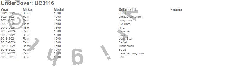 Brand: UnderCoverPart Number: UC3116Tonneau Cover Type: Black Textured - Will Not Fit Ram BoxUPC: 816391025900