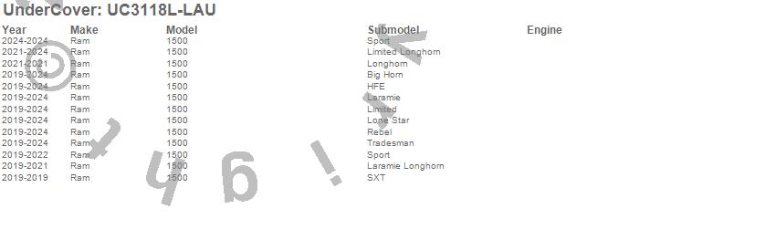 Brand: UnderCoverPart Number: UC3118L-LAUTonneau Cover Type: Granite Chrystal - Paint Code LAU - Will Not Fit Ram BoxUPC: 816391026082