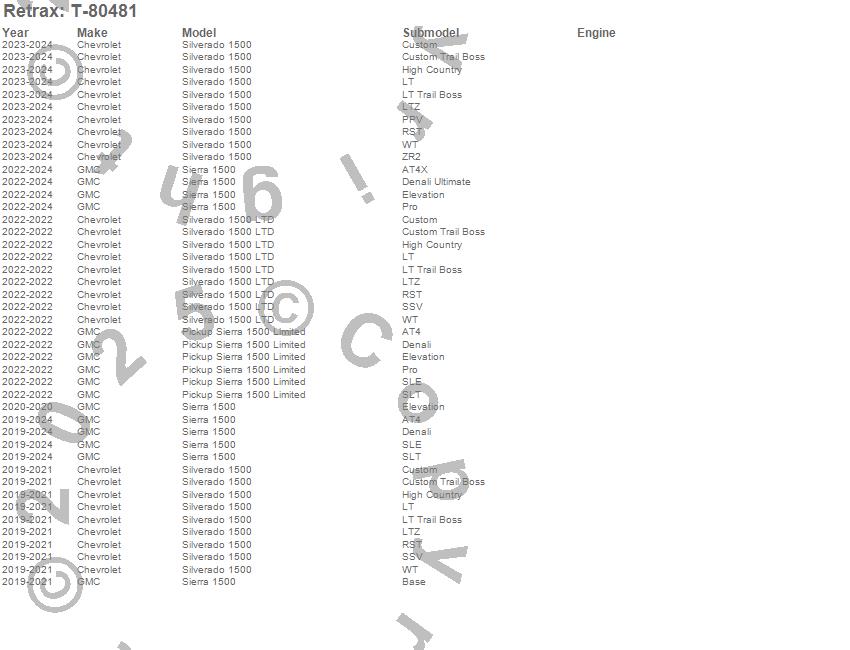 Below is an abbreviated list of applications for the RetraxPRO XR Retractable Tonneau Cover.Pickup Sierra 1500 Limited, Sierra 1500, Silverado 1500, Silverado 1500 LTD, Chevrolet, GMC, 2026, 2025, 2024, 2023, 2022, 2021, 2020, 2019