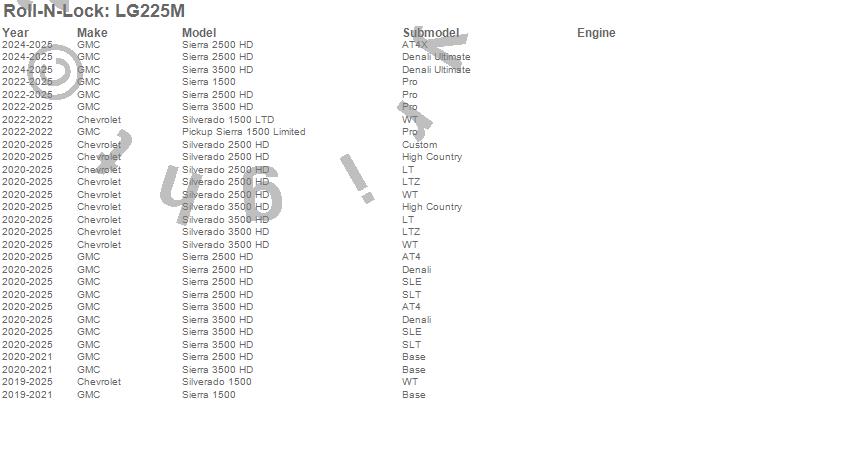 Below is an abbreviated list of applications for the Roll-N-Lock M-Series Truck Bed Cover.Pickup Sierra 1500 Limited, Sierra 1500, Sierra 2500 HD, Sierra 3500 HD, Silverado 1500, Silverado 1500 LTD, Silverado 2500 HD, Silverado 3500 HD, Chevrolet, GMC, 2025, 2024, 2023, 2022, 2021, 2020, 2019