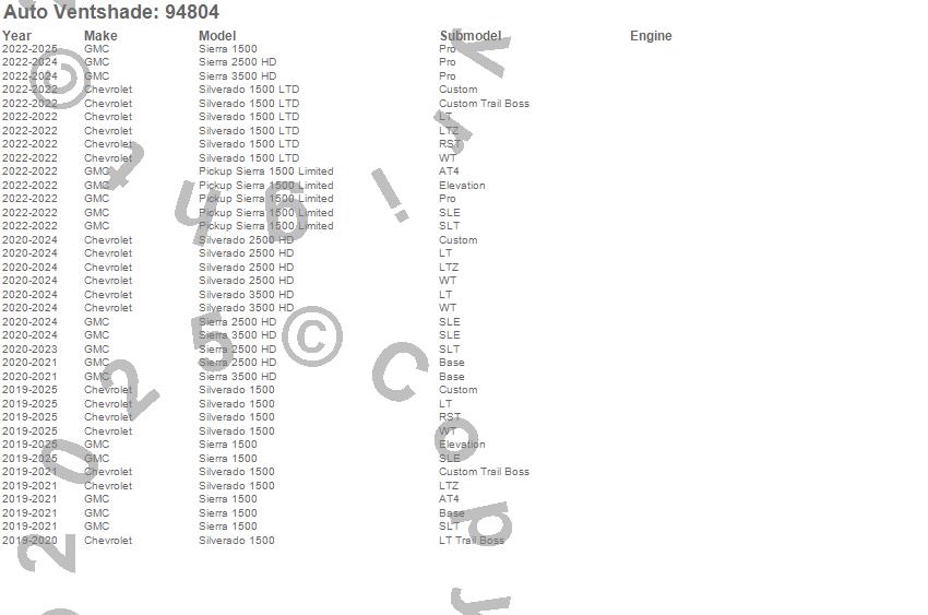 Below is an abbreviated list of applications for the Ventvisor Deflector 4 pc..Pickup Sierra 1500 Limited, Sierra 1500, Sierra 2500 HD, Sierra 3500 HD, Silverado 1500, Silverado 1500 LTD, Silverado 2500 HD, Silverado 3500 HD, Chevrolet, GMC, 2026, 2025, 2024, 2023, 2022, 2021, 2020, 2019