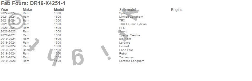 Brand: Fab FoursPart Number: DR19-X4251-1Bumper- Front Type: 2 Stage Black Powder Coat - 7/8 in. D-Ring Mounts - No GuardUPC: 005810118693