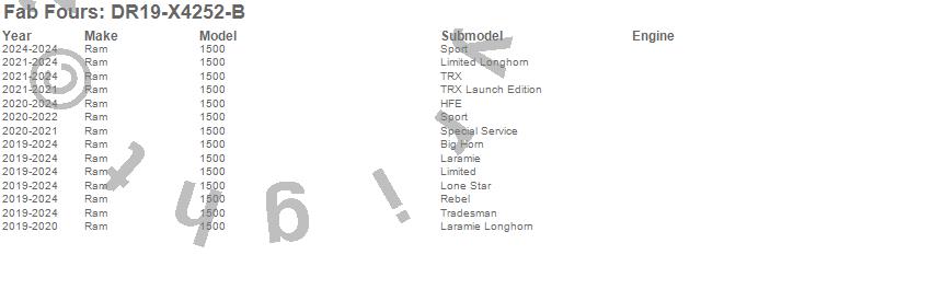 Brand: Fab FoursPart Number: DR19-X4252-BBumper- Front Type: Uncoated/Paintable - 7/8 in. D-Ring Mounts - Pre-Runner GuardUPC: 005810118723