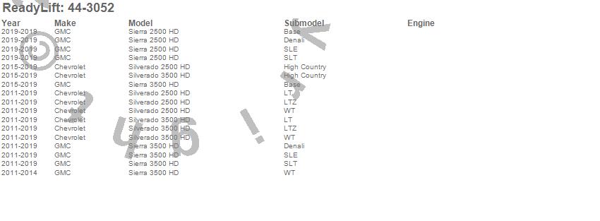 Below is an abbreviated list of applications for the Lift Kit w/Shocks.Sierra 2500 HD, Sierra 3500 HD, Silverado 2500 HD, Silverado 3500 HD, Chevrolet, GMC, 2019, 2018, 2017, 2016, 2015, 2014, 2013, 2012, 2011