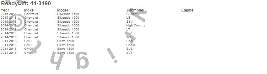 Below is an abbreviated list of applications for the Big Lift Kit w/Shocks.Sierra 1500, Silverado 1500, Chevrolet, GMC, 2018, 2017, 2016, 2015, 2014