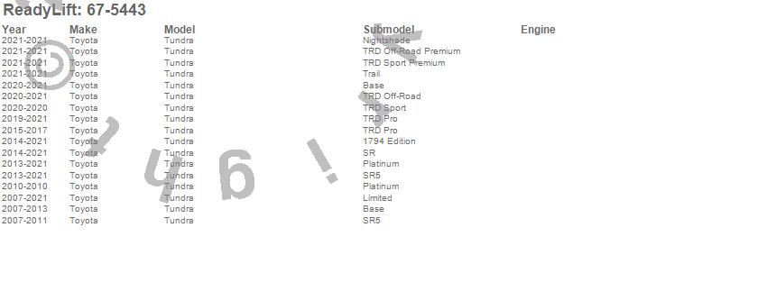 Below is an abbreviated list of applications for the TRD Pro Skid Plate.Tundra, Toyota, 2021, 2020, 2019, 2018, 2017, 2016, 2015, 2014, 2013, 2012, 2011, 2010, 2009, 2008, 2007