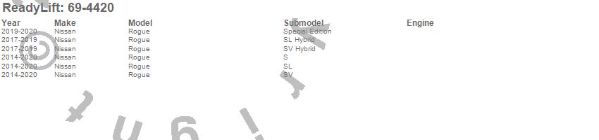 Below is an abbreviated list of applications for the SST Lift Kit.Rogue, Nissan, 2020, 2019, 2018, 2017, 2016, 2015, 2014