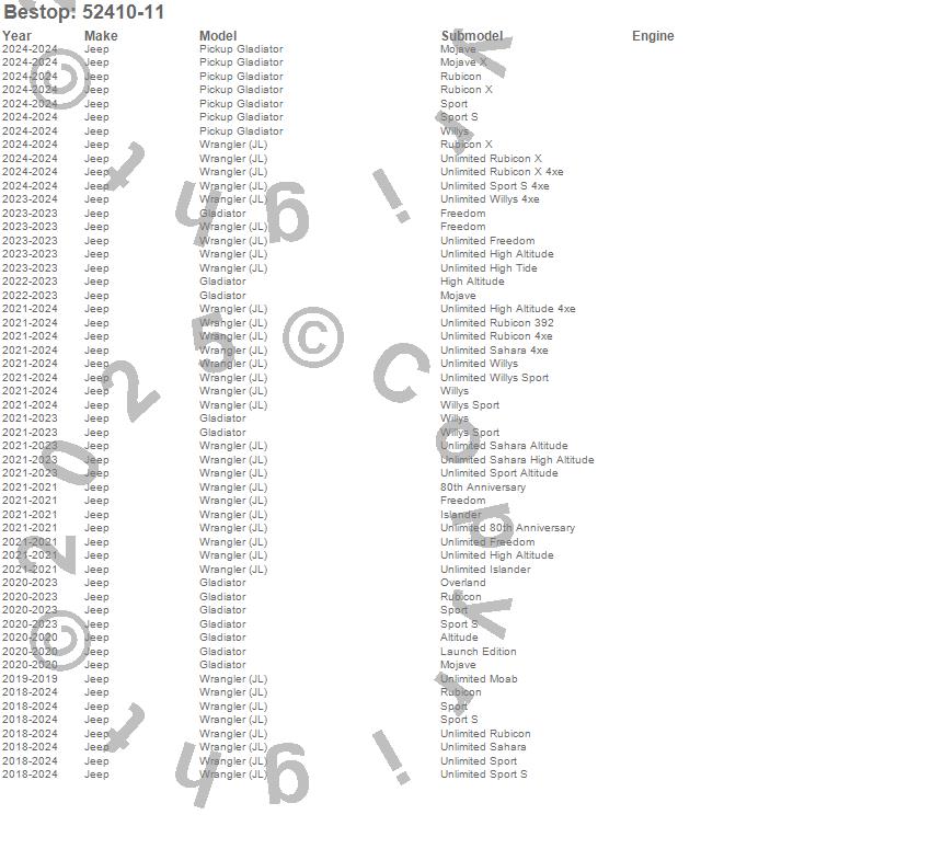 Below is an abbreviated list of applications for the Sun Standard Targa Style Bikini Top.Gladiator, Pickup Gladiator, Wrangler, Wrangler (JL), Jeep, 2026, 2024, 2023, 2022, 2021, 2020, 2019, 2018