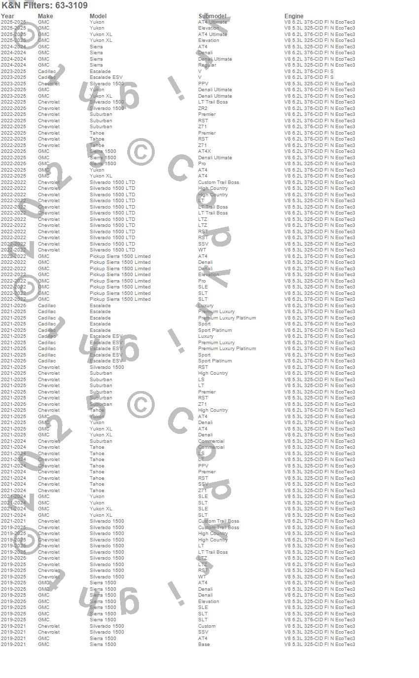 Below is an abbreviated list of applications for the 63 Series Aircharger Kit.Sierra 1500, Silverado 1500, Chevrolet, GMC, 2019
