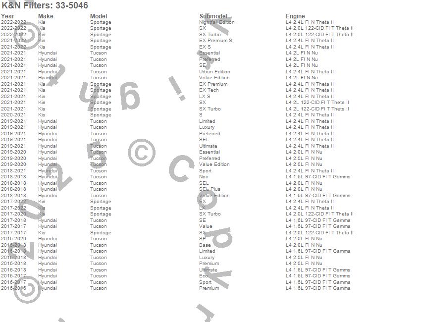 Below is an abbreviated list of applications for the Air Filter.Sportage, Tucson, Hyundai, Kia, 2019, 2018, 2017, 2016