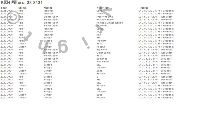 Below is an abbreviated list of applications for the Air Filter.