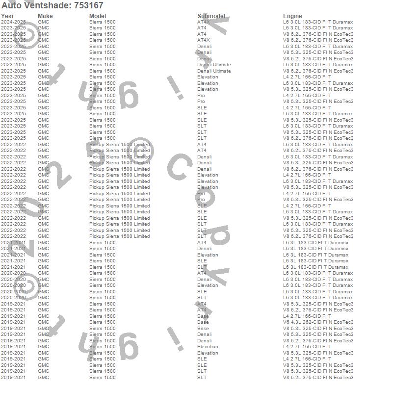 Below is an abbreviated list of applications for the Aeroskin LightShield Hood Protector.Pickup Sierra 1500 Limited, Sierra 1500, GMC, 2025, 2024, 2023, 2022, 2021, 2020, 2019
