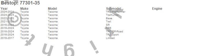 Below is an abbreviated list of applications for the Supertop For Truck.Tacoma, Toyota, 2024, 2023, 2022, 2021, 2020, 2019, 2018, 2017, 2016