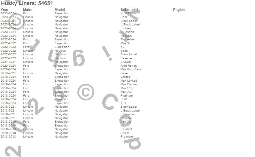 Below is an abbreviated list of applications for the X-act Contour Floor Liner.Expedition, Navigator, Ford, Lincoln, 2024, 2023, 2022, 2021, 2020, 2019, 2018