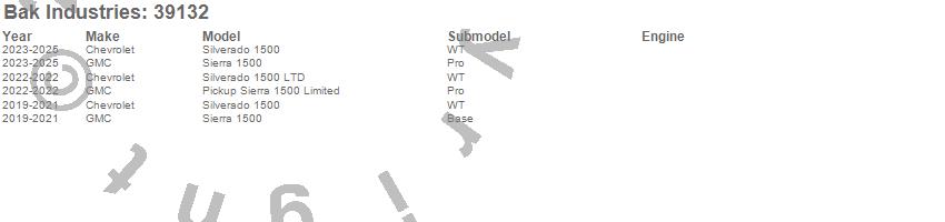 Brand: BAK IndustriesPart Number: 39132Tonneau Cover Type: Vinyl Top w/ Aluminum Underside - Black - Leather Grain FinishUPC: 192631020516