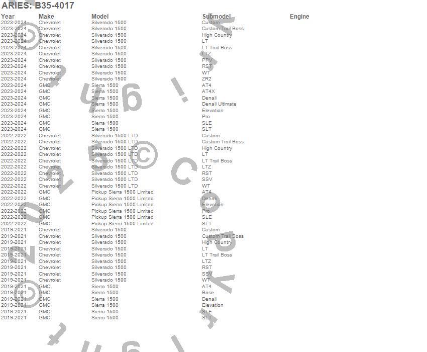 Below is an abbreviated list of applications for the Bull Bar.Pickup Sierra 1500 Limited, Sierra 1500, Silverado 1500, Silverado 1500 LTD, Chevrolet, GMC, 2024, 2023, 2022, 2021, 2020, 2019