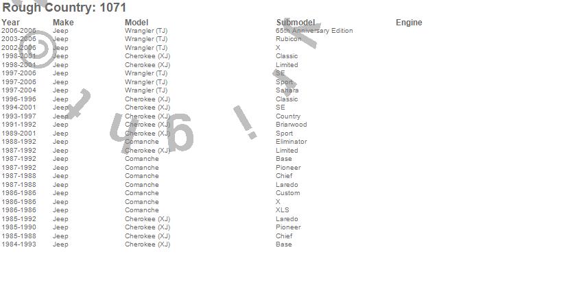 Brand: Rough CountryPart Number: 1071Control Arm Type: For 3-4.5 in. Lift - Fixed-LengthUPC: 843030100780