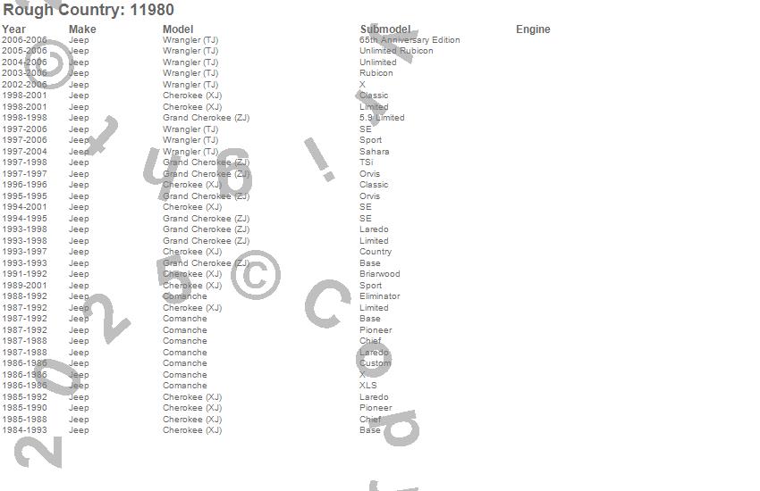 Below is an abbreviated list of applications for the X-Flex Control Arm Set.Cherokee (XJ), Comanche, Grand Cherokee (ZJ), Wrangler (TJ), Jeep, 2006, 2005, 2004, 2003, 2002, 2001, 2000, 1999, 1998, 1997, 1996, 1995, 1994, 1993, 1992