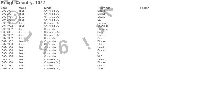 Below is an abbreviated list of applications for the Transfer Case Drop Kit.Cherokee (XJ), Comanche, Jeep, 2001, 2000, 1999, 1998, 1997, 1996, 1995, 1994, 1993, 1992, 1991, 1990, 1989, 1988, 1987, 1986, 1985