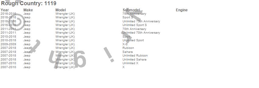 Below is an abbreviated list of applications for the Bump Stop Extension Kit.Wrangler (JK), Jeep, 2018, 2017, 2016, 2015, 2014, 2013, 2012, 2011, 2010, 2009, 2008, 2007