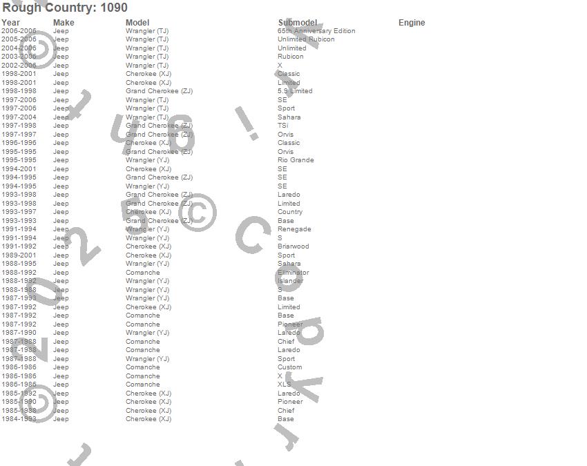 Below is an abbreviated list of applications for the Wheel Spacer.Cherokee (XJ), Comanche, Grand Cherokee (ZJ), Wrangler (TJ), Wrangler (YJ), Jeep, 2006, 2005, 2004, 2003, 2002, 2001, 2000, 1999, 1998, 1997, 1996, 1995, 1994, 1993