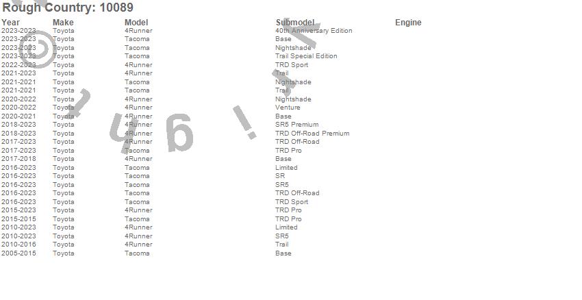 Below is an abbreviated list of applications for the Wheel Spacer.4Runner, Tacoma, Toyota, 2024, 2023, 2022, 2021, 2020, 2019, 2018, 2017, 2016, 2015, 2014, 2013, 2012, 2011, 2010, 2009, 2008