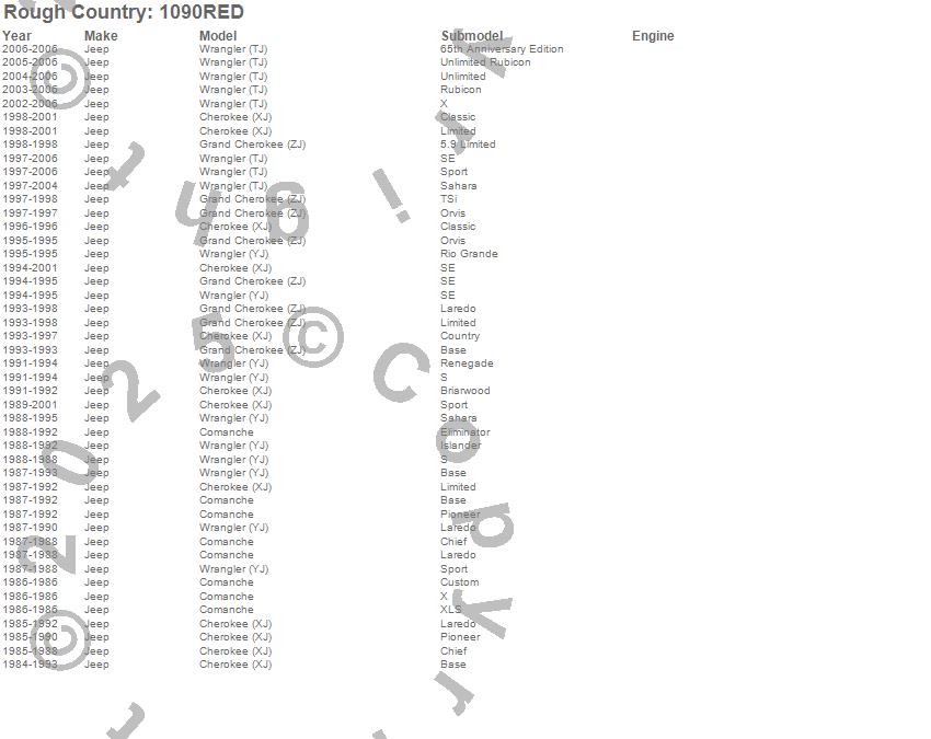 Below is an abbreviated list of applications for the Wheel Spacer.Cherokee (XJ), Comanche, Grand Cherokee (ZJ), Wrangler (TJ), Wrangler (YJ), Jeep, 2006, 2005, 2004, 2003, 2002, 2001, 2000, 1999, 1998, 1997, 1996, 1995, 1994, 1993