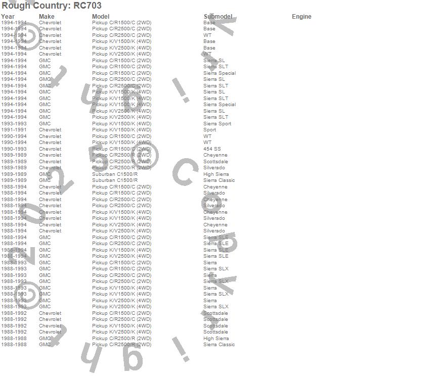 Below is an abbreviated list of applications for the Body Lift Kit.C1500 Pickup, C2500 Pickup, K1500, K1500 Pickup, K2500 Pickup, R2500 Pickup, Chevrolet, GMC, 1994, 1993, 1992, 1991, 1990, 1989, 1988