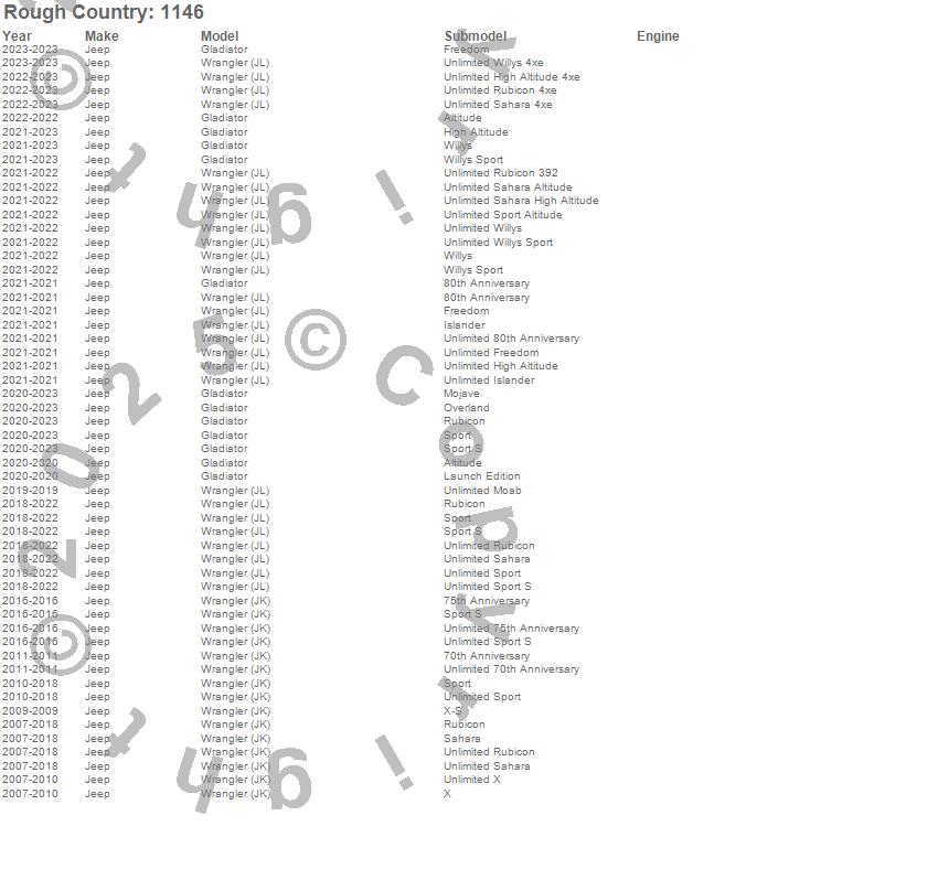 Brand: Rough CountryPart Number: 1146Sway Bar Quick Disconnect End Link Type: Incl. Quick Disconnects - Frame Brackets - Bushings - Pins - HardwareUPC: 843030101442