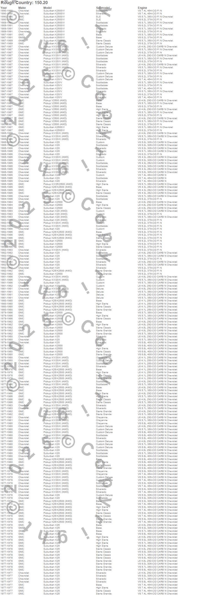 Brand: Rough CountryPart Number: 150.20Lift Kit-Suspension w/Shock Type: 4 in. LiftUPC: 843030130015