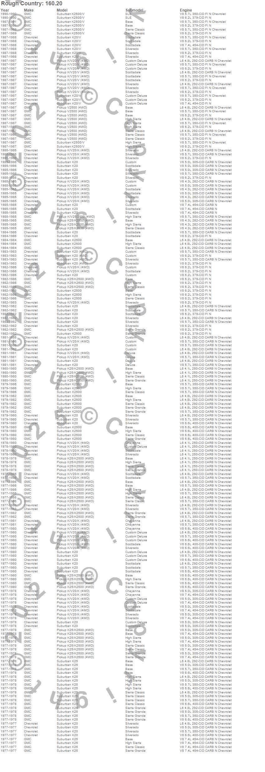 Below is an abbreviated list of applications for the Suspension Lift Kit w/Shocks.K20 Pickup, K20 Suburban, K25 Pickup, K25 Suburban, K2500 Pickup, K2500 Suburban, V20 Pickup, V20 Suburban, V2500 Pickup, V2500 Suburban, Chevrolet, GMC, 1991, 1990, 1989, 1988, 1987, 1986, 1985, 1984