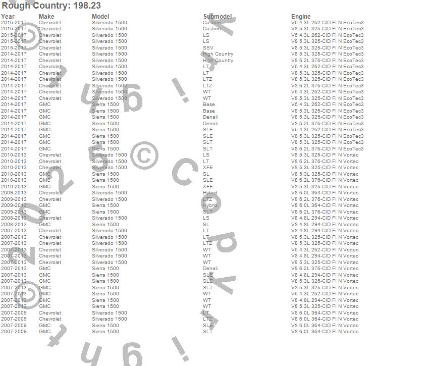 Below is an abbreviated list of applications for the Suspension Lift Kit w/Shocks.Sierra 1500, Silverado 1500, Chevrolet, GMC, 2017, 2016, 2015, 2014, 2013, 2012, 2011, 2010, 2009, 2008, 2007