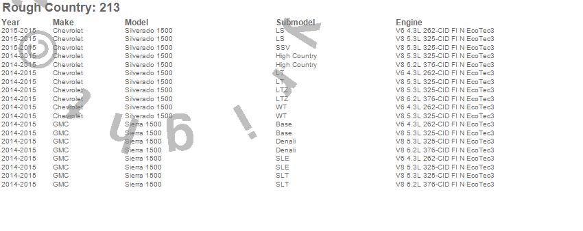 Below is an abbreviated list of applications for the Combo Suspension Lift Kit.Sierra 1500, Silverado 1500, Chevrolet, GMC, 2015, 2014