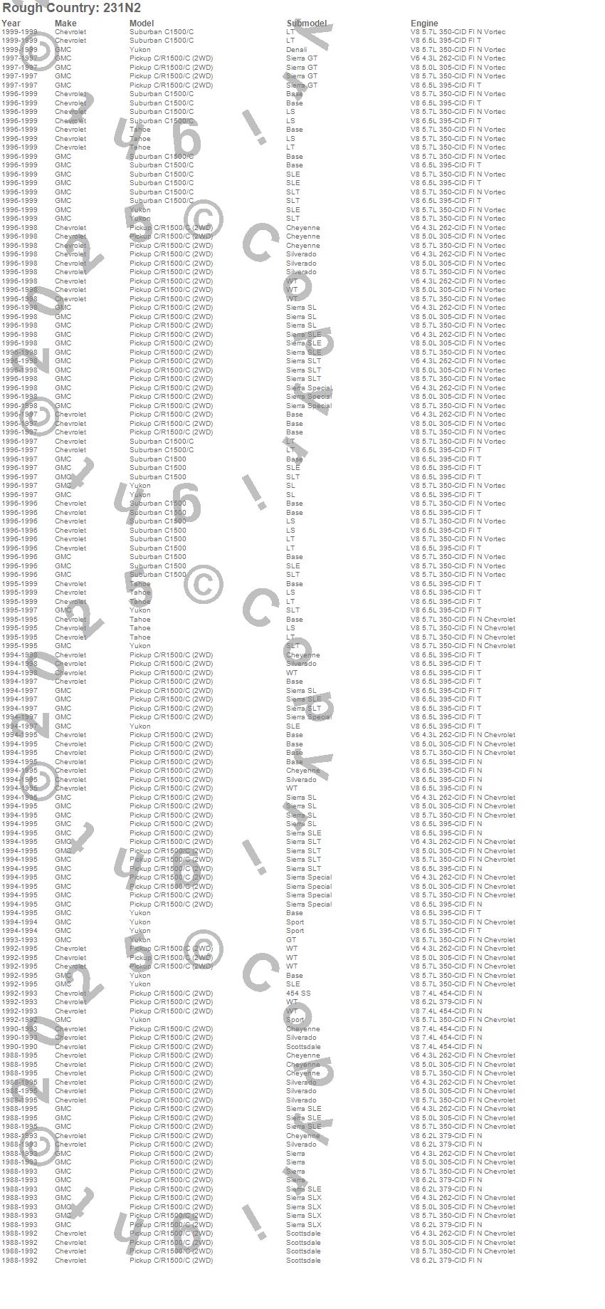 Below is an abbreviated list of applications for the Suspension Lift Kit w/Shocks.C1500 Pickup, C1500 Suburban, Tahoe, Yukon, Chevrolet, GMC, 1999, 1998, 1997, 1996, 1995, 1994, 1993, 1992, 1991, 1990, 1989, 1988