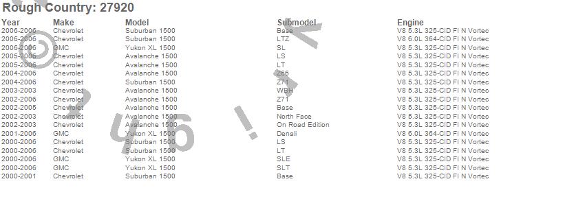 Below is an abbreviated list of applications for the Non-Torsion Drop Suspension Lift Kit.Avalanche 1500, Suburban 1500, Yukon XL 1500, Chevrolet, GMC, 2006, 2005, 2004, 2003, 2002, 2001, 2000