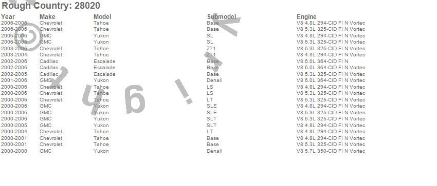 Below is an abbreviated list of applications for the Non-Torsion Drop Suspension Lift Kit.Escalade, Tahoe, Yukon, Cadillac, Chevrolet, GMC, 2006, 2005, 2004, 2003, 2002, 2001, 2000