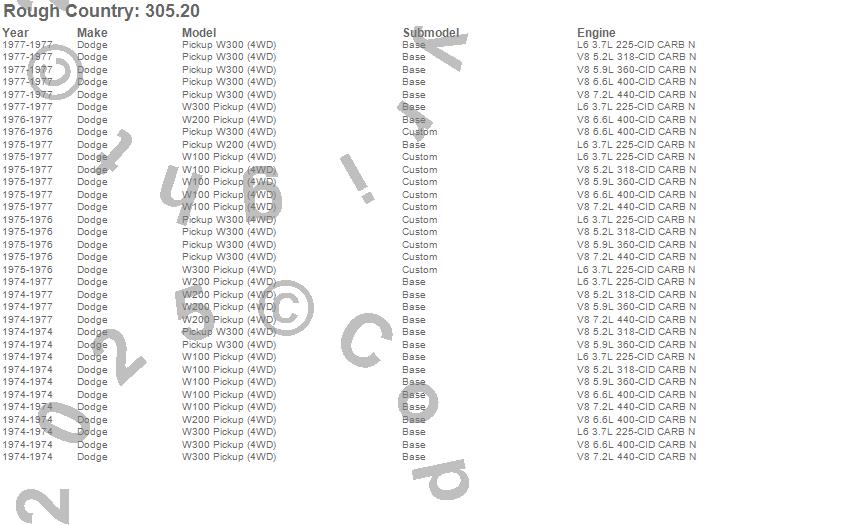 Below is an abbreviated list of applications for the Suspension Lift Kit w/Shocks.W100 Pickup, W200 Pickup, W300 Pickup, Dodge, 1977, 1976, 1975, 1974