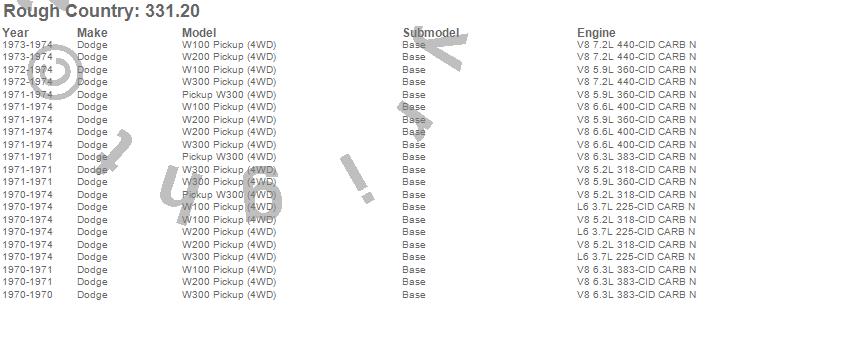 Below is an abbreviated list of applications for the Suspension Lift Kit w/Shocks.W100 Pickup, W200 Pickup, W300 Pickup, Dodge, 1974, 1973, 1972, 1971, 1970