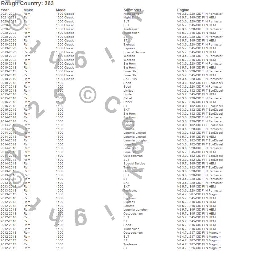 Below is an abbreviated list of applications for the Leveling Lift Kit.1500, 1500 Classic, Ram, 2023, 2022, 2021, 2020, 2019, 2018, 2017, 2016, 2015, 2014, 2013, 2012