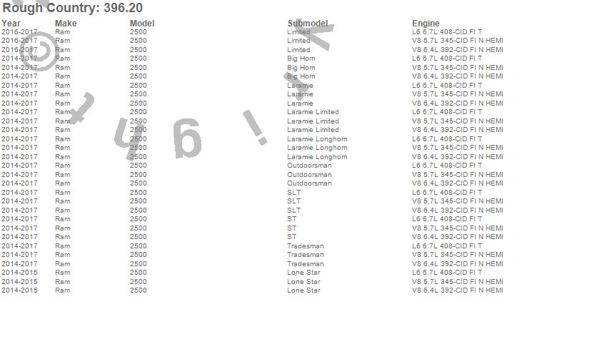 Below is an abbreviated list of applications for the Suspension Lift Kit w/Shocks.2500, Ram, 2017, 2016, 2015, 2014