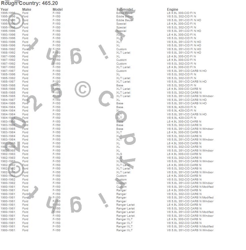 Below is an abbreviated list of applications for the Suspension Lift Kit w/Shocks.F-150, Ford, 1996, 1995, 1994, 1993, 1992, 1991, 1990, 1989, 1988, 1987, 1986, 1985, 1984, 1983, 1982, 1981, 1980