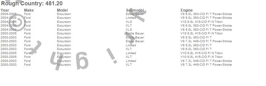 Below is an abbreviated list of applications for the Suspension Lift Kit w/Shocks.Excursion, Ford, 2005, 2004, 2003, 2002, 2001, 2000