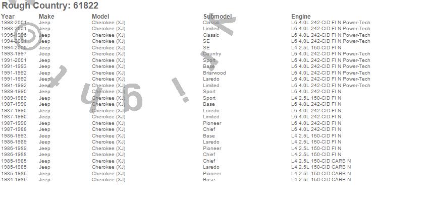 Below is an abbreviated list of applications for the X-Series Long Arm Suspension Lift Kit w/Shocks.Cherokee (XJ), Jeep, 2001, 2000, 1999, 1998, 1997, 1996, 1995, 1994, 1993, 1992, 1991, 1990, 1989, 1988, 1987, 1986, 1985, 1984