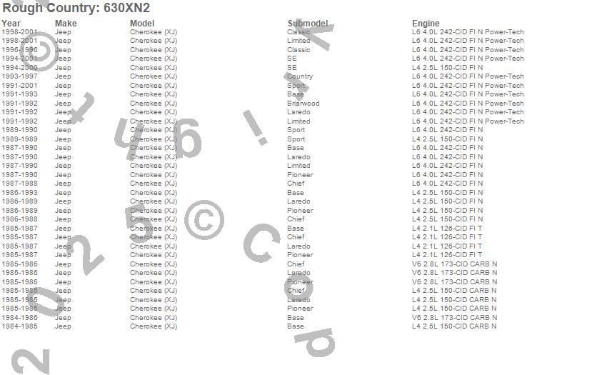 Below is an abbreviated list of applications for the Series II Suspension Lift Kit.Cherokee (XJ), Jeep, 2001, 2000, 1999, 1998, 1997, 1996, 1995, 1994, 1993, 1992, 1991, 1990, 1989, 1988, 1987, 1986, 1985, 1984