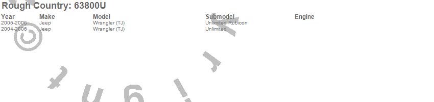 Brand: Rough CountryPart Number: 63800USuspension Upgrade Kit Type: For 4-6 in. Lift - Incl. Front And Rear Control Arms w/X-Flex Joints - Mounting Brkts - Rubicon Compressor Brkt - Clevite Bushings - Track Bar BrktUPC: 843030124953