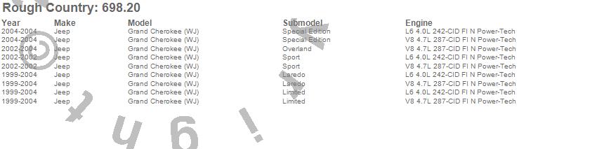 Below is an abbreviated list of applications for the Suspension Lift Kit w/Shocks.Grand Cherokee (WJ), Jeep, 2004, 2003, 2002, 2001, 2000, 1999