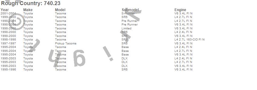 Below is an abbreviated list of applications for the Suspension Lift Kit w/Shocks.Tacoma, Toyota, 2004, 2003, 2002, 2001, 2000, 1999, 1998, 1997, 1996, 1995