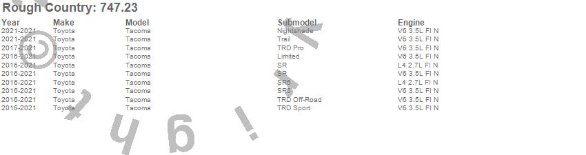 Brand: Rough CountryPart Number: 747.23Lift Kit-Suspension w/Shock Type: 6 in. LiftUPC: 843030125356